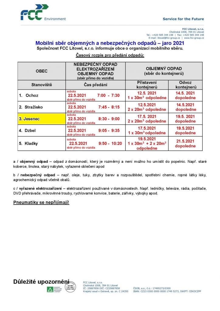 Mobilní sběr objemných a nebezpečných odpadů - jaro 2021