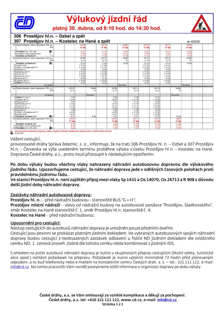 Výlukový jízdní řád platný 30. dubna, od 8:10 hod. do 14:30 hod.